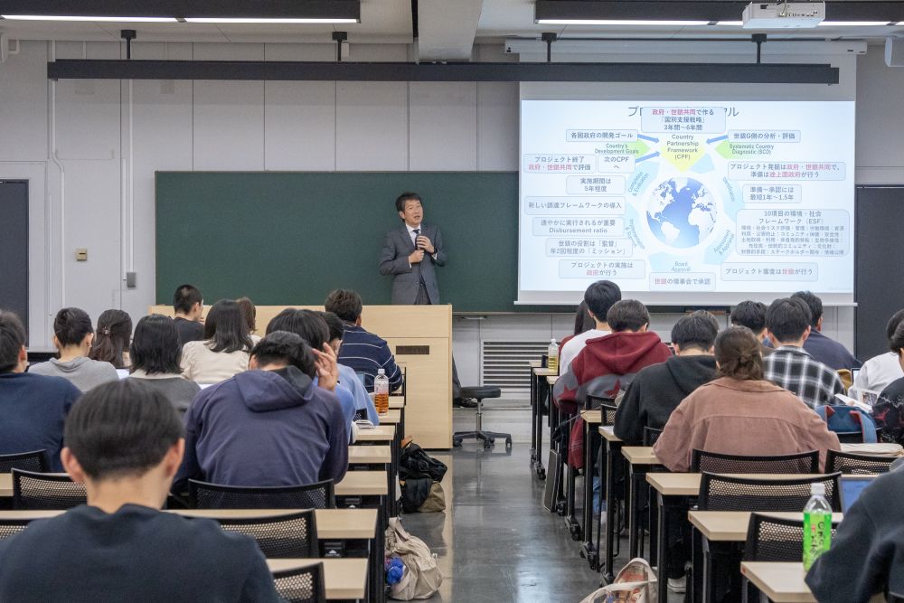 2025年10月28日、経済学部の科目「国際開発論」(担当:林光洋)において、世界銀行で長年勤務する大森功一上級対外関係担当官をお招きし、公開特別授業を実施しました。授業では、世界銀行の概要と役割、具体的なプロジェクトの進め方に加え、国際機関で働くことの実際やキャリア形成について、体験にもとづくお話を伺いました。