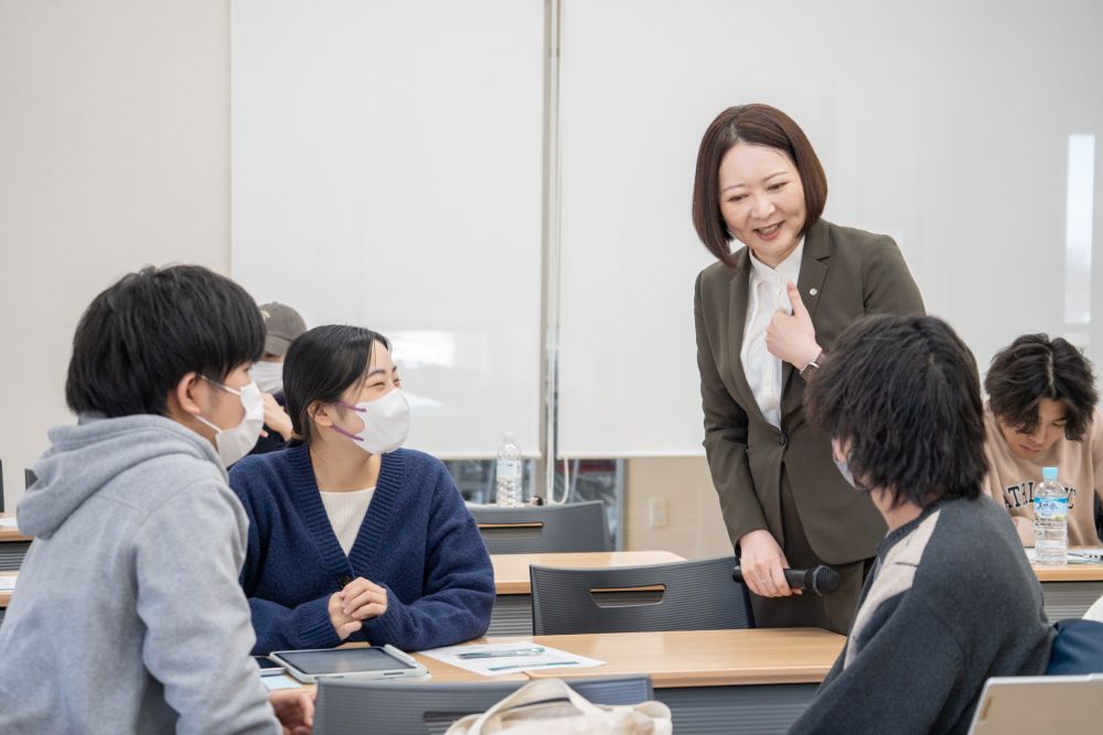 授業の冒頭では、「なぜ、あえて“高い方”を選んだのですか」というテーマのもと、ミニディスカッションが実施されました。学生たちは3人程度のグループに分かれ、外食やスマートフォン、イヤフォンといった身近な品から航空機のチケットに至るまで、「あえて高いほうを選んだ」自身の経験を共有し、その理由を言語化していきました。物事の背後にある「見えづらい価値」に意識を向ける、非常に有意義な時間となりました。