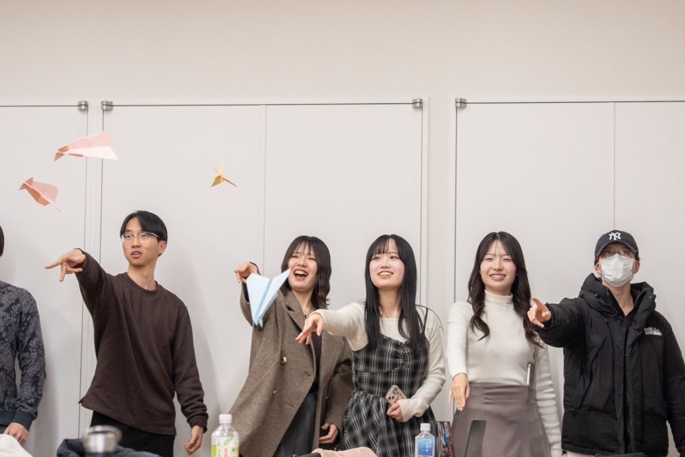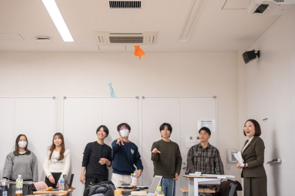 授業の最後には「折り紙チャレンジ」が行われました。学生たちが各々好きな色で折った紙飛行機に未来への希望を込め、一斉に飛ばして今年度の授業を締めくくりました。