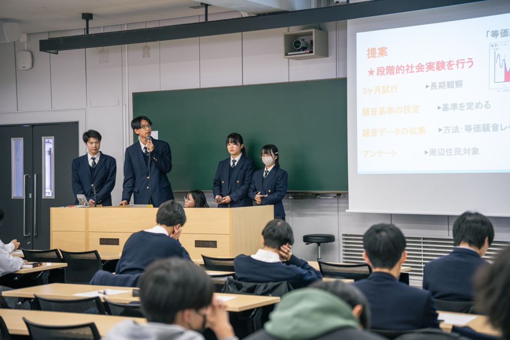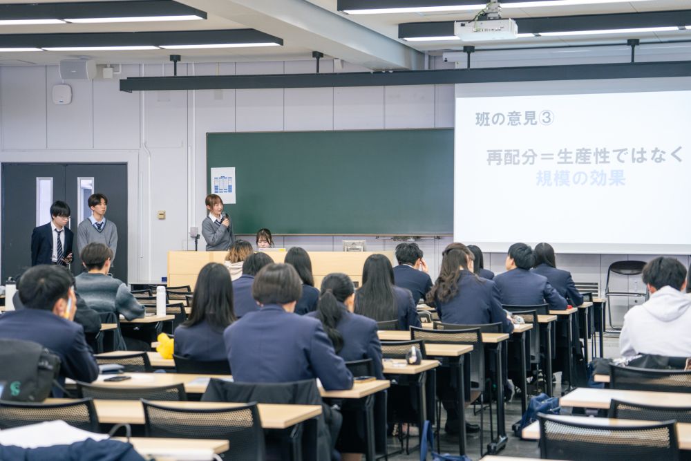 経済学部教員が提示した4つの課題から興味を持った分野を選び、与えられた課題に対して少人数チームで解決策を模索し、研究発表をするというものです。 経済学部教員と現役ゼミ生からアドバイスをもらえる事前相談会が2回設けられ、附属4校の生徒たちは論の組み立てからプレゼン資料の作り方など、多くの指導を受けて完成させていきました。