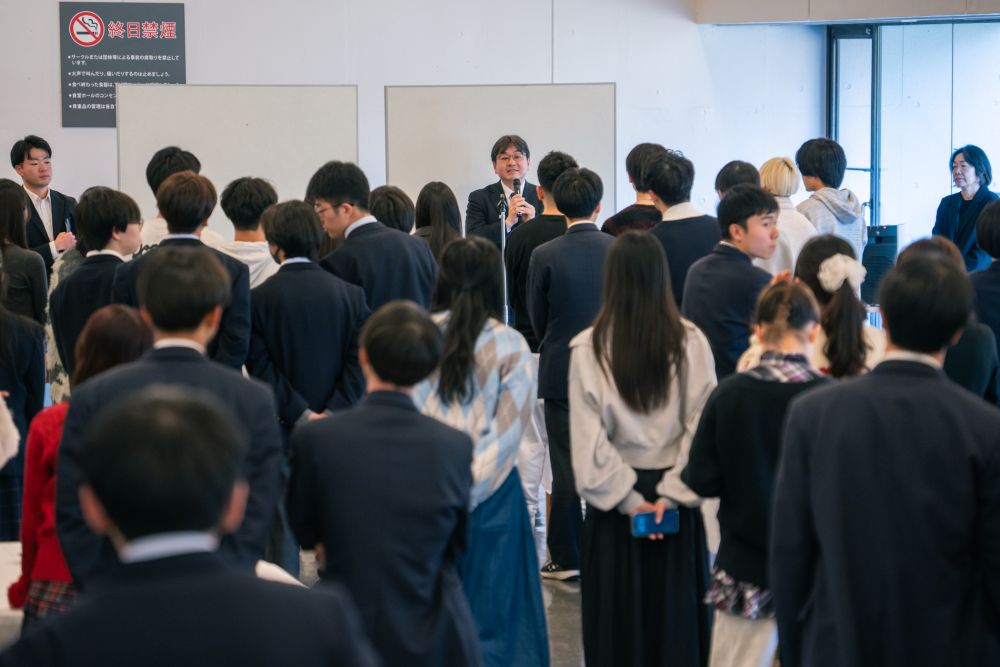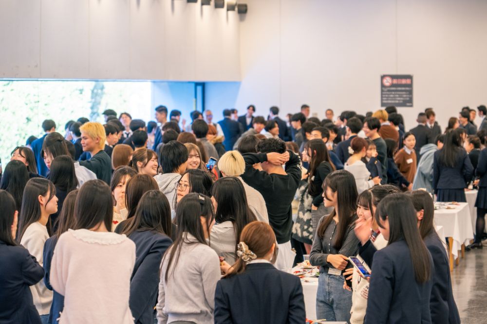 結果発表と教員からの講評の後は、ヒルトップ(学生食堂)にて懇親会が催されました。後藤学部長が生徒たちを労うと大きな歓声があがり、例年よりも活気のある印象でした。生徒たちは4月からの大学生活を前に、出身校の枠を越えて学友となっていました。