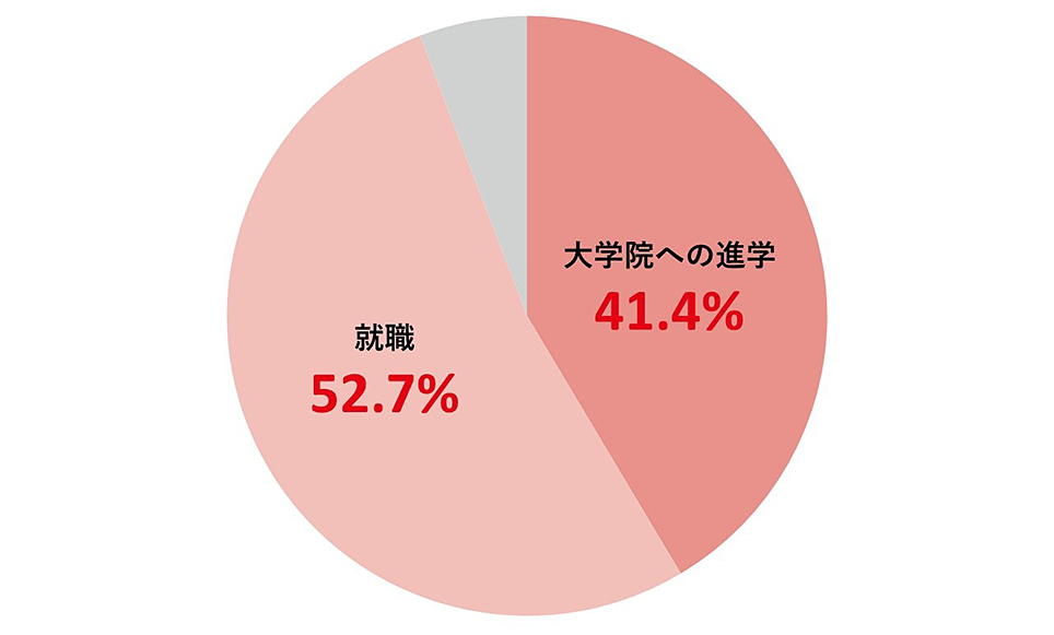 基幹理工学部では、多くの学生が大学院に進学して専門的なスキルを身に着け、幅広い業界(製造、IT、金融、教育など)へ巣立っていきます。 さらに、一部の学生は博士後期課程へ進学し、研究者として大学や多くの研究機関で活躍しています。