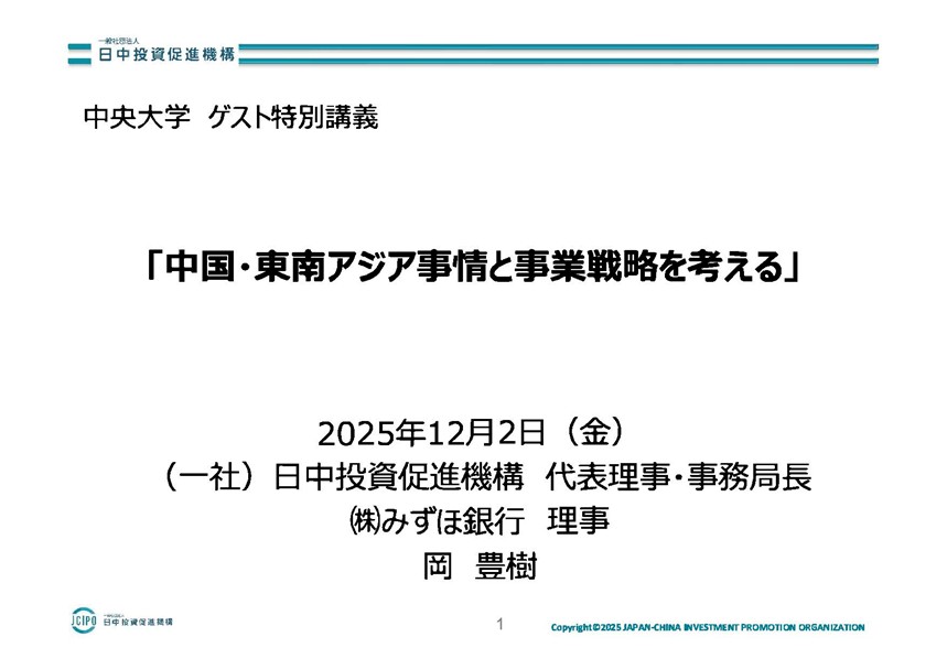 2025年12月2日に「国際直接投資論」の授業(担当教員:陳 建安)にて日中投資促進機構の岡豊樹事務局長をお招きし、「中国・東南アジア事情と事業戦略を考える」について講義いただきました。