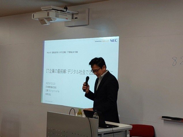 12月23日に「IT戦略論」(担当教員:内平直志)において、ゲストスピーカーによるご講義が行われました。今回は講師として日本電気株式会社 主席プロフェッショナルの中村公弘氏をお招きし、「IT企業の最前線:デジタル社会で活躍するために」という題目でご講演をいただきました。