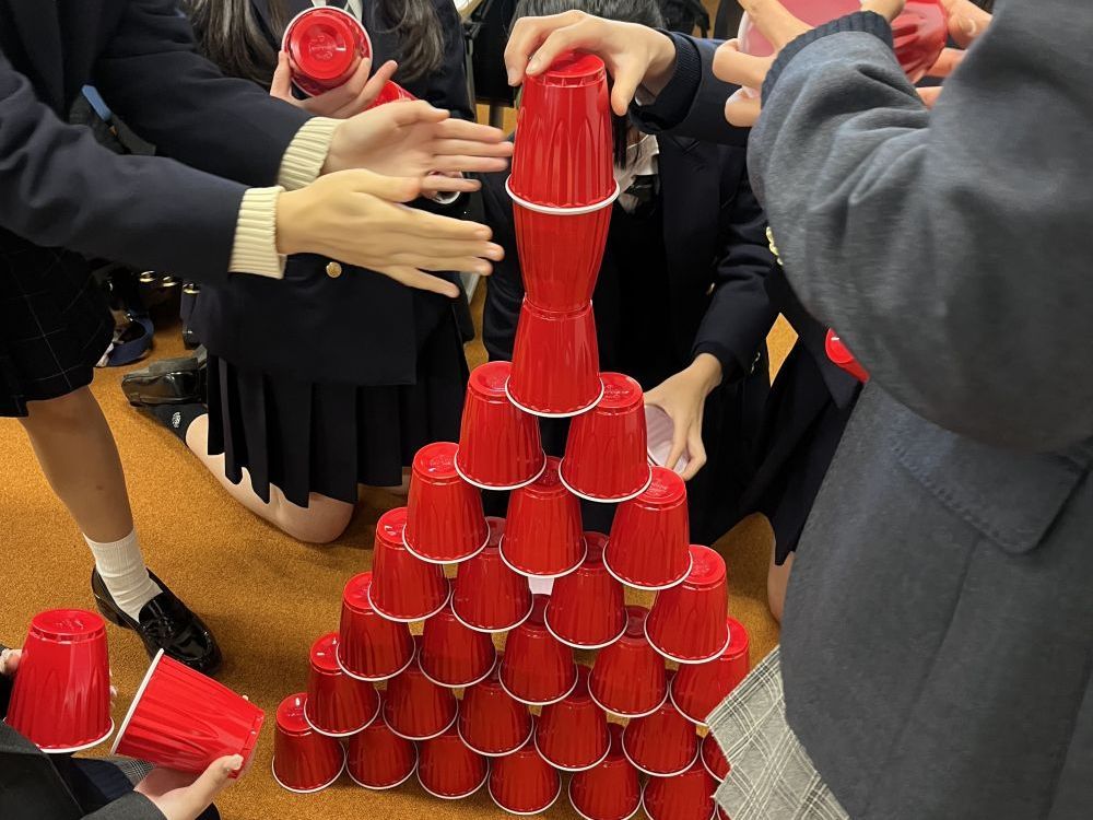 今年度のプログラムは、杉本豊彦ゼミに所属する在学生が企画・運営を担当しました。冒頭では杉本先生の挨拶に続き、在学生によるアイスブレイクとしてグループワーク型のゲームを実施しました。附属生は4グループに分かれ、制限時間1分でコップを積み上げて最も高いタワーを作るゲームに挑戦。短時間での勝負ということもあり、会場は大いに盛り上がりました。続くチャレンジでは、戦略を考える時間を設け、改善策を取り入れながら再挑戦することで、初対面同士でも自然とコミュニケーションが生まれ、協力し合う姿が見られました。
