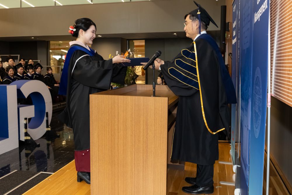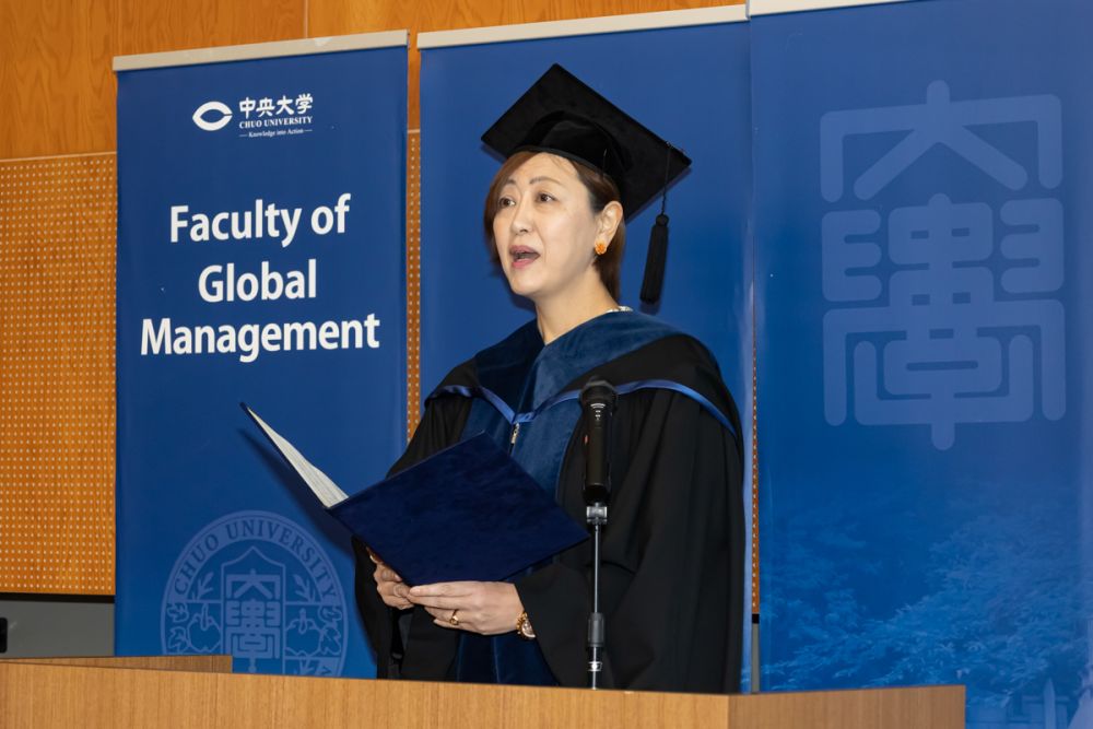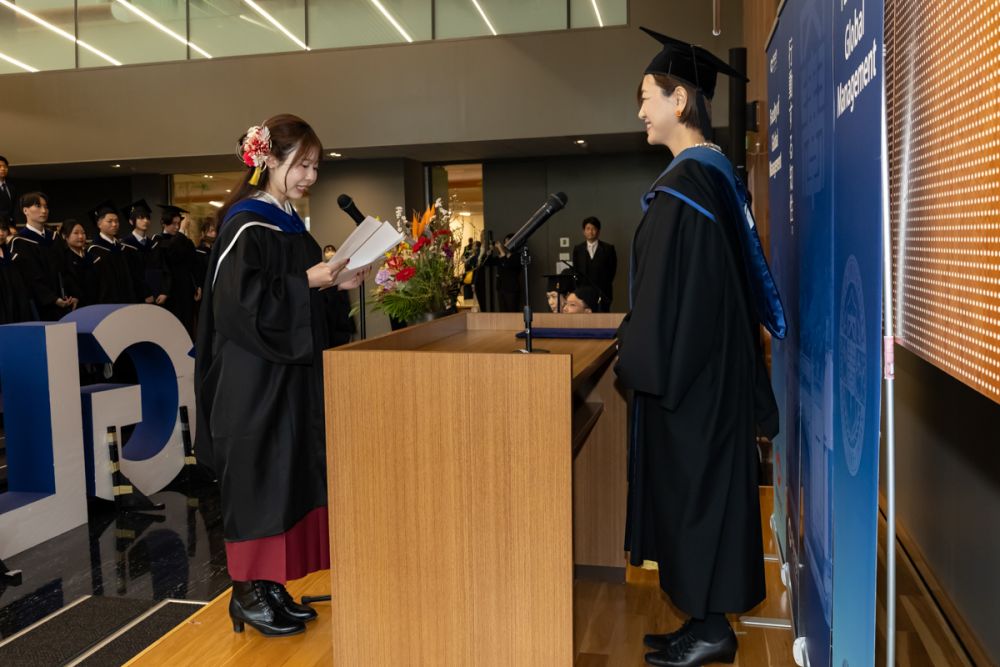 2026年3月25日(水)、多摩キャンパスForest Gateway Chuo 3階Hallにて、国際経営学部独自の企画として卒業セレモニーを挙行しました。