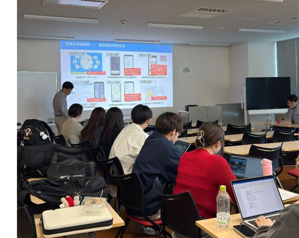 2026年4月21日、一般社団法人スマートシティ・インスティテュートのチーフ・データ・サイエンティストである鈴木龍二様にお越しいただき、スマートシティに関するご講義と、学生によるプレゼンテーションの講評をいただきました。現在、3年次の6期生はスマートシティを研究テーマとし、4つのグループに分かれて春合宿以降、研究を進めております。また今学期は、2026年7月21日に開催予定のスマートシティ・インスティテュート主催ウェビナーでの発表に向けて、引き続き研究に注力してまいります。