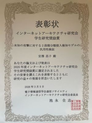 松崎ゼミの学生が2025年度インターネットアーキテクチャ研究会で発表を行い、学生研究奨励賞を受賞しました。