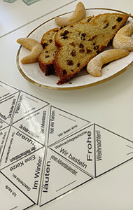 また、学生同士のつながりも魅力の一つである。選択科目では受講者が10名以下になることもあり、学年を越えて一つの机を囲みながら学んでいる。単語の意味を推測したり、日本ではなじみの薄い文化について意見を交わしたりする中で、多角的な視点が育まれていく。教員も初級者に配慮した語彙で丁寧に解説してくださるため、安心して議論に参加できる。未知の言語に挑戦するからこそ、学生同士で励まし合いながら成長していける環境がある。本稿とともに載せた写真は、昨年、ドイツ人教員が焼いてくださったシュトレンを囲みながら、受講生8名でクリスマス会をした一コマだ。ドイツでは、華やかなクリスマスマーケットが有名だ。そのような楽しい雰囲気を、学内で友人とともに味わえる時間は、かけがえのないものである。