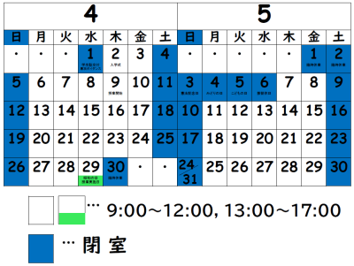 国文学研究室の4~5月の開室は次の通りです。