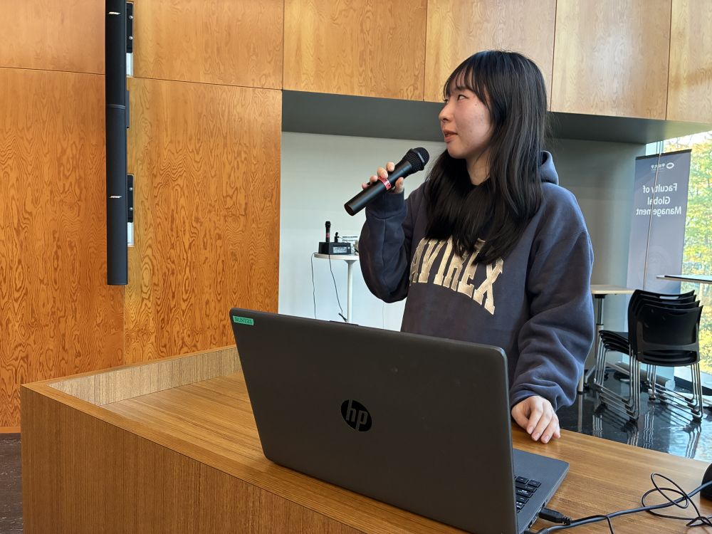 発表では、文化の違い、グローバルな競技環境で体感したさまざまな「違い」が、生きた学びとなっていることが語られました。