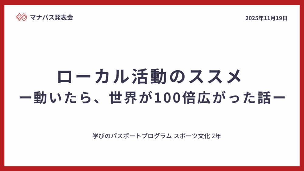 今回の学生発表会は、仲間の活躍を知ることで、ローカルな活動とグローバルな活動が相容れない経験ではなく、相互に影響し合いながら広がっていくことを実感する機会となりました。塗師さん、兼吉さんの今後のさらなる活躍を期待するとともに、本企画をきっかけに、学びのパスポート学生一人ひとりが、それぞれのグローカルな挑戦を広げていくことを願っています。