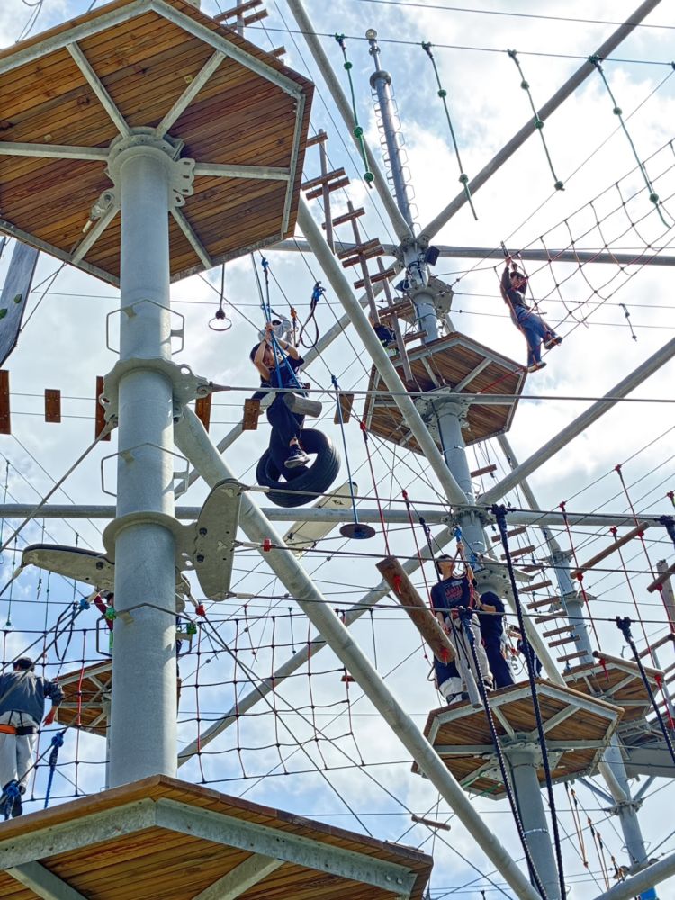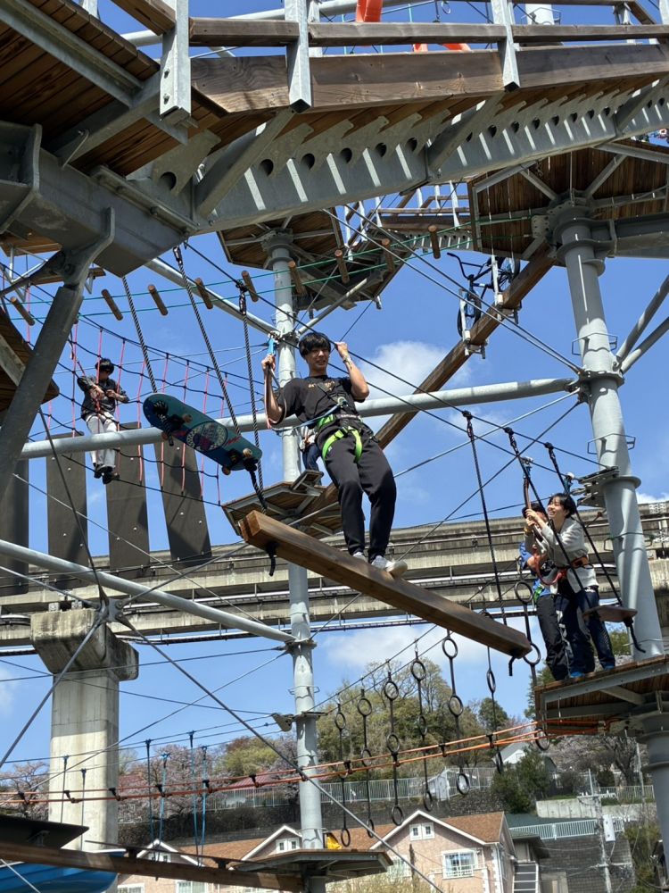 地上を見下ろすスリルの中、学生たちは3人1組で協力しながら、難易度の異なるコースにチャレンジしました。