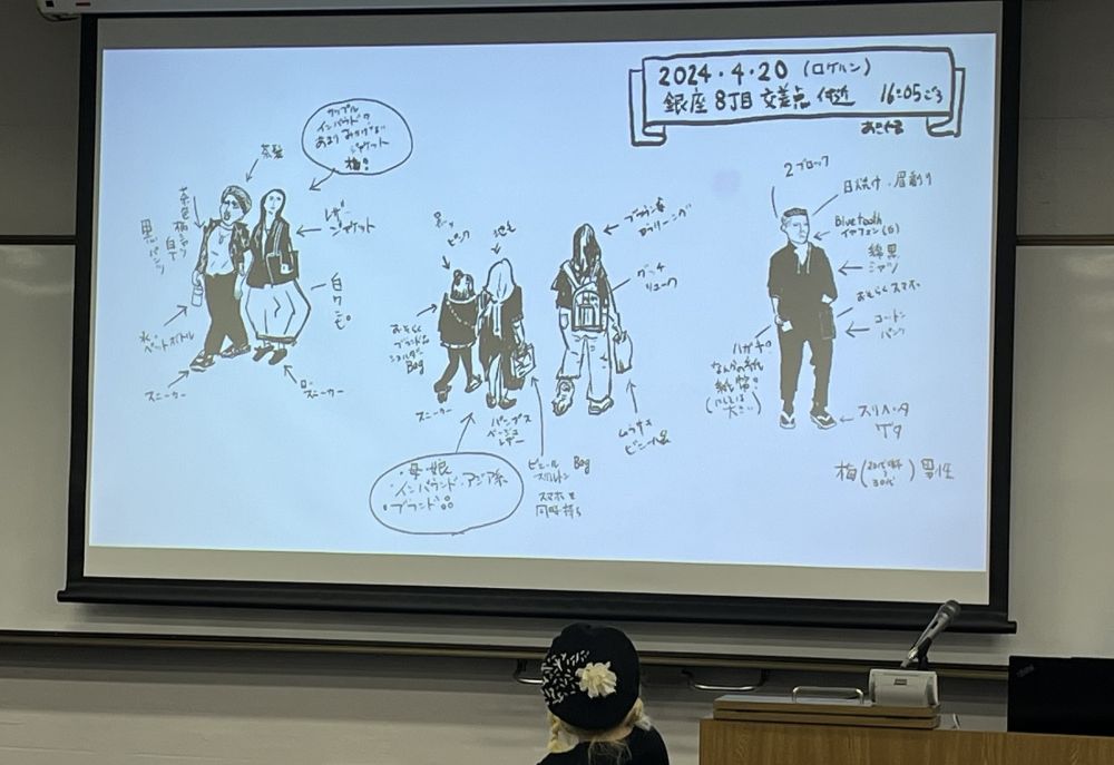 今和次郎たちが「東京銀座街風俗記録」の調査をおこなったのは1925年5月。そのちょうど100年後の同じ日、同じ場所で、同じ手法による記録調査をおこなった考現学サロンのみなさんから、考現学とは何かから始まり、考現学の面白さや実際の調査で難しかったことなど、さまざまなお話をうかがったうえで、履修者たちも当日の映像で考現学的調査を体験しました。