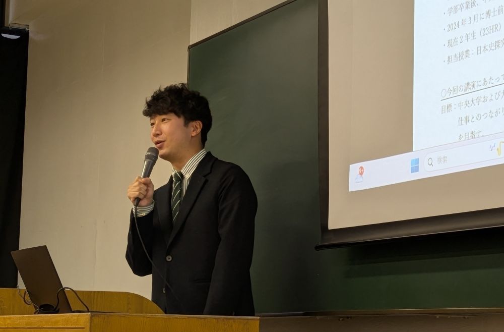 日本史学専攻では、2025年11月6日(木)4限に、卒業生を迎えて講演会を実施しました。この講演会は例年実施しているもので、卒業後の進路に向けた活動がこれから本格化する3年生を対象として、さまざまな分野に進んだ卒業生のお話を伺うことで、今後のキャリアを考えるための参考としてもらうことを目的としています。