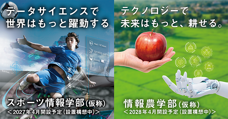 「スポーツ情報学部(仮称)」および「情報農学部(仮称)」の最新情報については、随時、公式Webサイトおよび後日公開予定の特設サイトにて発信いたします。