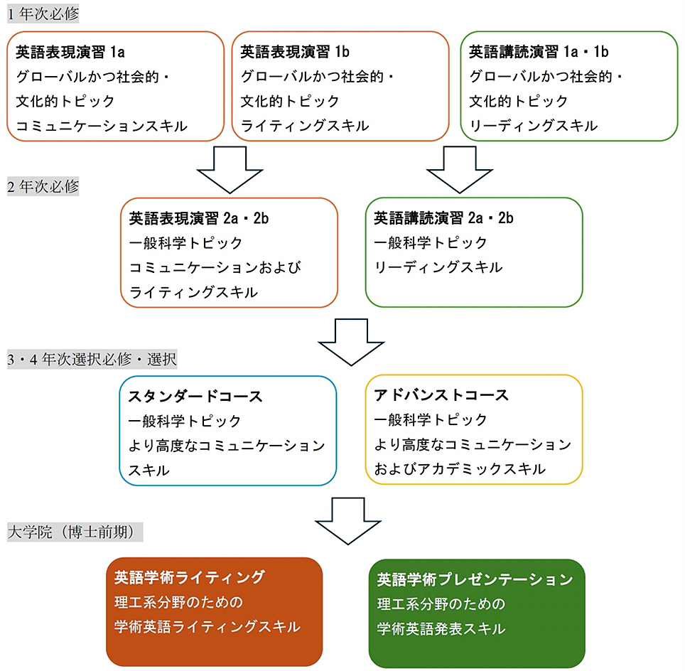 学部レベルでは、英語運用能力の伸長と同時に、理工系学部の学生にとっても不可欠な現代のグローバル・文化的トピックへの理解、そして各学部・学科での専門分野の学修や研究に必須となる一般科学トピックへの理解を、必修の学部1年次・2年次の英語学習を通じて修得できます。さらに発展的な学習を継続したい学生は、3・4年次の選択必修・選択科目で、より高度な英語運用能力を身につけることができます。その際には、学生個人の能力や目的に応じて2つのコース(スタンダード、アドバンスト)に分かれた科目群を履修します。
