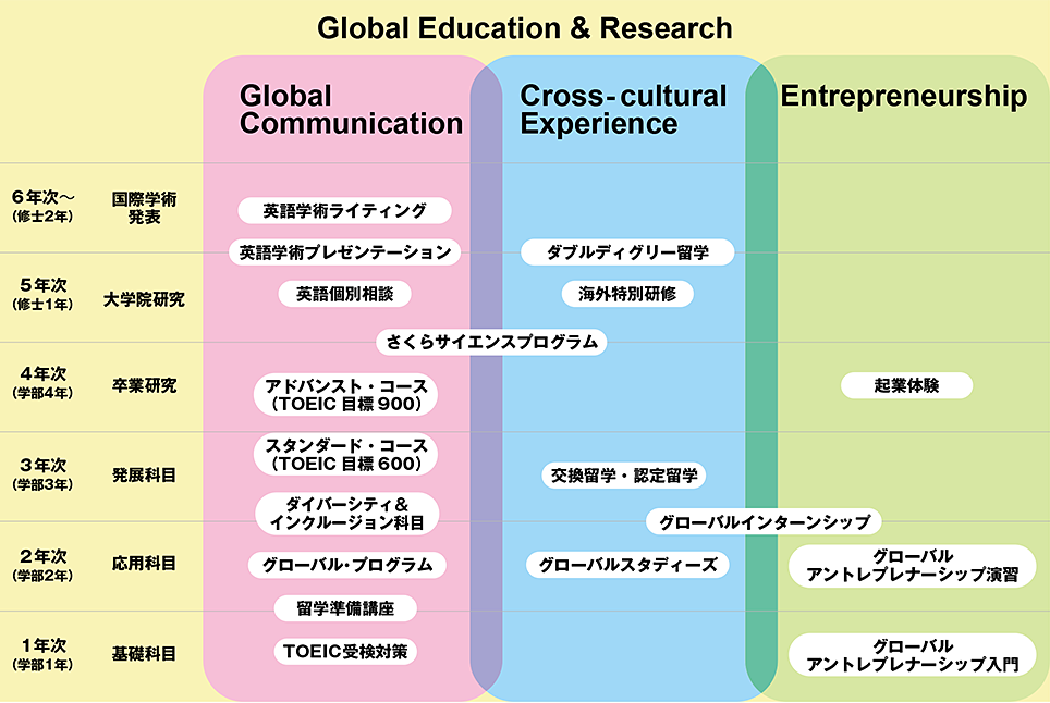 理工学の確固たる知識と教養を基礎とし、高度な英語運用能力とグローバルな視点を持ち、新たな価値を創造する精神(アントレプレナーシップ)とを兼ね備えた人材の育成に取り組んでいます。