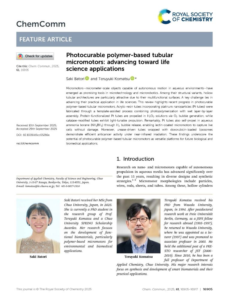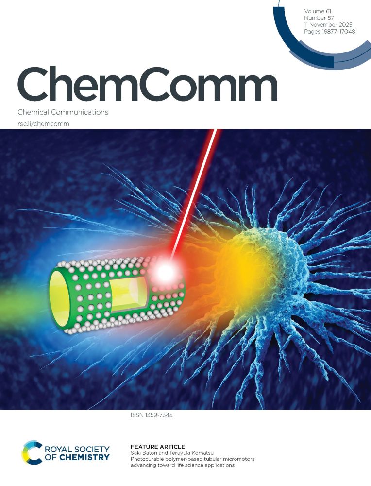 理工学研究科博士後期課程(応用化学専攻)1年 馬鳥沙希さん、同教授 小松晃之の「高分子チューブマイクロモーター:ライフサイエンスの応用に向けて」という総説論文(Feature Article)が、英国王立化学会誌 Chemical Communications に掲載され、HOT articles 2025に選ばれました。掲載論文のわずか5%のみに与えられる栄誉です。さらに、本論文のイラストが掲載号の表紙を飾りました。Gold Open Access なのでどなたでも閲覧いただけます。
