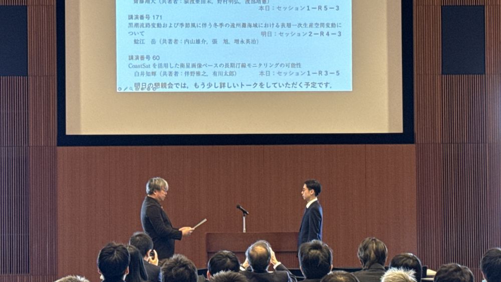 都市人間環境学専攻博士後期3年の白井知輝さん (有川研究室)が「海岸工学論文奨励賞」を受賞しました。本賞は、土木学会論文集特集号(海岸工学,81巻17号)に掲載された164編の論文のうち、萌芽性あるいは独創性に富み、発展が期待される論文の筆頭著者(32歳以下)に対して授与されるものです。