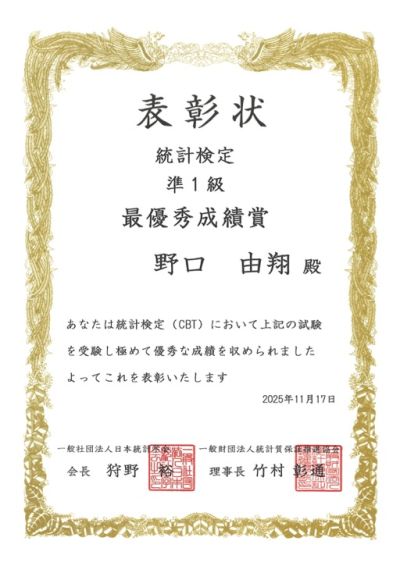 2025年11月に実施された統計検定にて、以下の学生が、統計検定準1級に合格し、さらに、最優秀成績賞も受賞しました。 ・野口由翔 (ビジネスデータサイエンス学科4年, 長塚研究室)