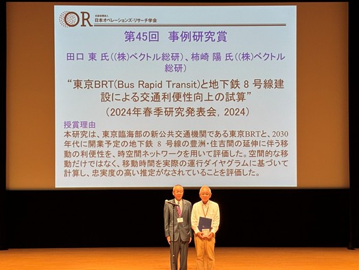 理工学部(情報工学科)名誉教授 田口東(株式会社ベクトル総研 技術顧問)が、柿崎陽氏(株式会社ベクトル総研 主任研究員)との共同研究「東京BRT(Bus Rapid Transit)と地下鉄8号線建設による交通利便性向上の試算」を発表し、優れた事例研究として日本オペレーションズ・リサーチ学会第45回事例研究賞を受賞しました。