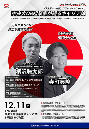 理工学研究科 情報工学専攻 博士前期課程(2010年修了)柄沢聡太郎さんが中央大学キャリアセンター主催の夕活講座『起業家卒業生による講演会(第1弾)」に登壇いたします。