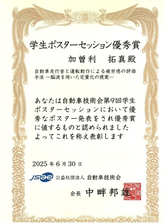 精密工学専攻の加曽利拓真さんが自動車技術会 2025年春季大会 第9回学生ポスターセッションにて「優秀賞」を受賞