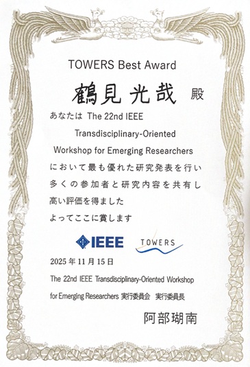 精密工学専攻・中村研究室の鶴見光哉さん(博士前期課程1年)が日本工学院専門学校/蒲田キャンパス(東京都・大田区)で開催された国際会議The 22nd IEEE TOWERS(The 22nd IEEE Transdisciplinary-Oriented Workshop for Emerging Researchers)にて「TOWERS Best Award」を受賞しました。