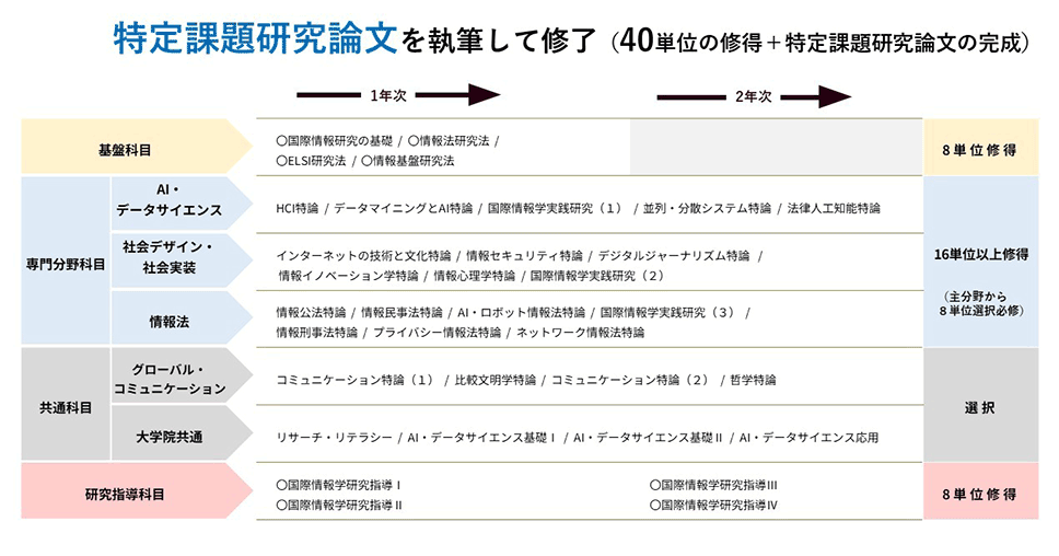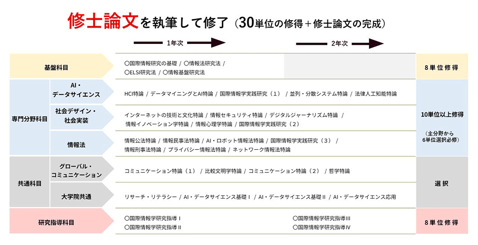 2つのコースにおいて、「基盤科目」の「国際情報研究の基礎」「ELSI研究法」「情報基盤研究法」「情報法研究法」4科目、計8単位を必修とします。また「研究指導科目」のうち、指導教員が担当する「国際情報学研究指導Ⅰ~Ⅳ」の計8単位を必修とします。
