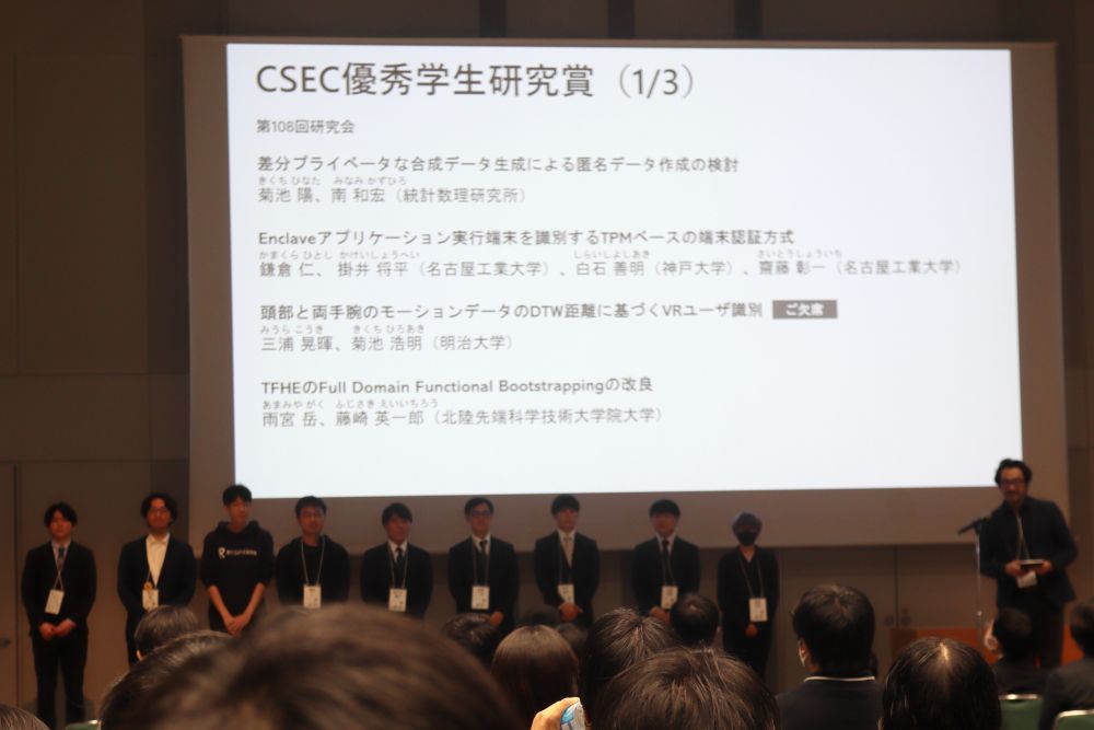 「CSEC優秀学生研究賞」は、2025年3月17日から18日にかけて前橋市で開催された「情報処理学会 第202回マルチメディア通信と分散処理・第108回コンピュータセキュリティ合同研究発表会」における発表について、優秀と認められた学生に授与されるものです。