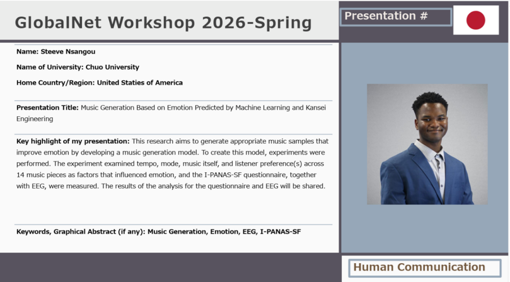 2026年3月9日(月)~13日(金)に九州産業大学にて開催された「電子情報通信学会総合大会」の初日に開催されたGrobalNet Workshopにおいて、理工学研究科ビジネスデータサイエンス専攻 庄司裕子研究室研究生のSteeve Nsangouさん(米国フルブライト奨学生)が、研究成果を”Music Generation Based on Emotion Predicted by Machine Learning and Kansei Engineering”と題してポスター発表し、108件中5件の優秀発表賞を受賞しました。