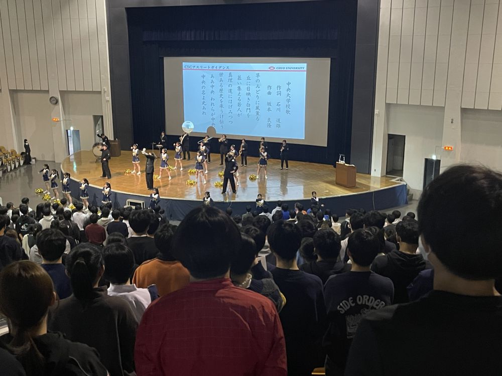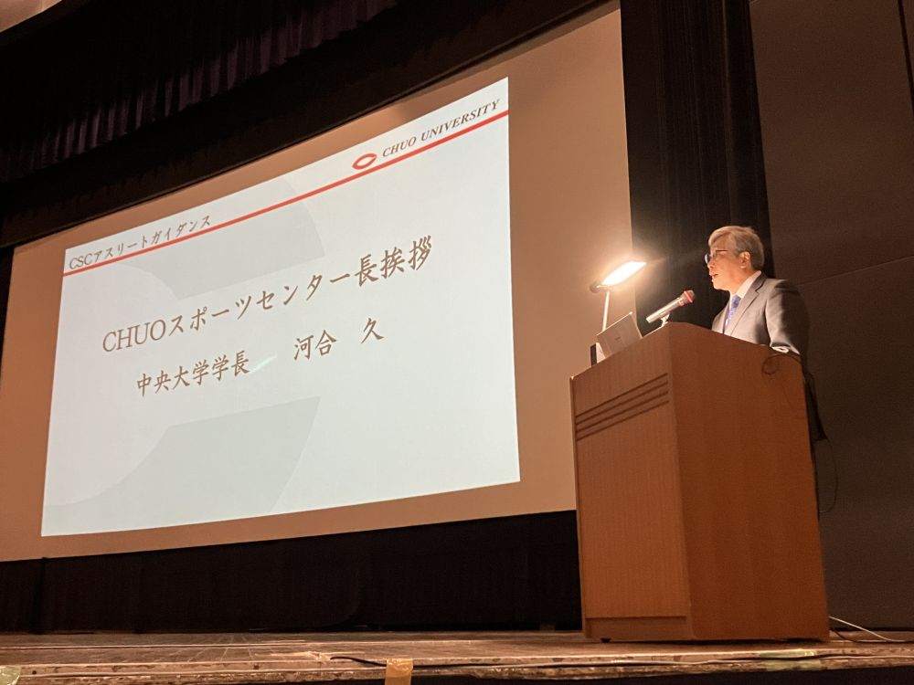 2025年度CSCアスリートガイダンスにおいては、河合久CHUOスポーツセンター長(学長)による挨拶 に続き、株式会社dscの今井渓太氏(本学卒業生)を講師にお招きし、「真のプロフェッショナルとデュアルキャリアの本質」と題してご講演いただきました 。本学サッカー部OBでもある今井氏より 、ご自身の体験に基づいたデュアルキャリアの考え方やインテグリティの重要性についてお話しいただき、参加した学生たちは「ニューアスリート」を目指して明日から実践すべき行動について深く考える貴重な時間となりました。また、CHUOスポーツセンター事務室からは今後の学生生活についての説明が行われ 、最後は應援團による演舞で締めくくられました 。