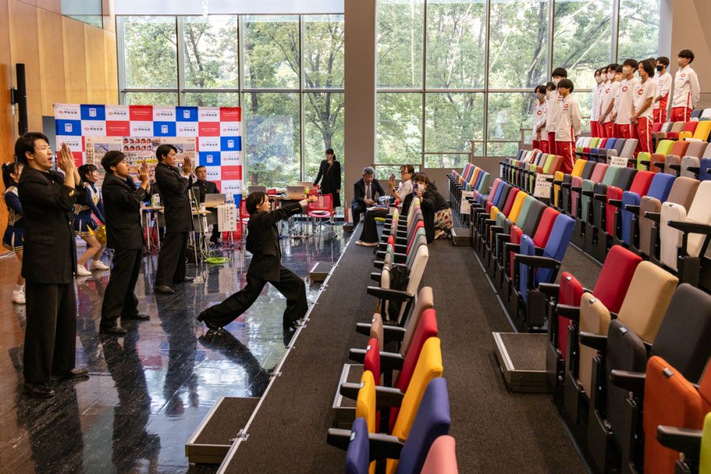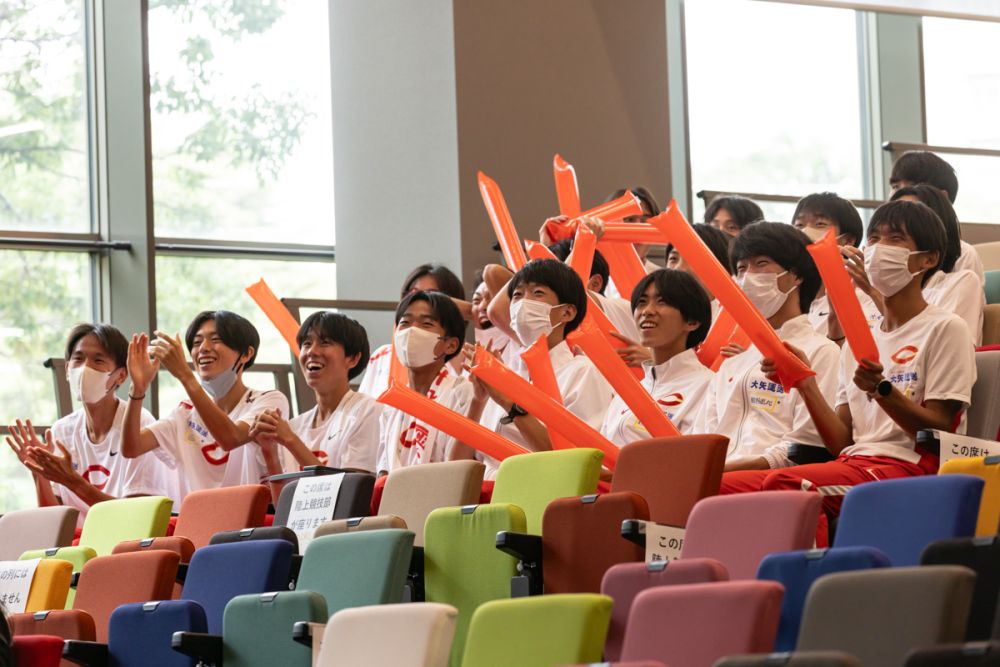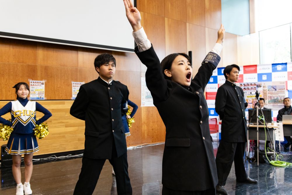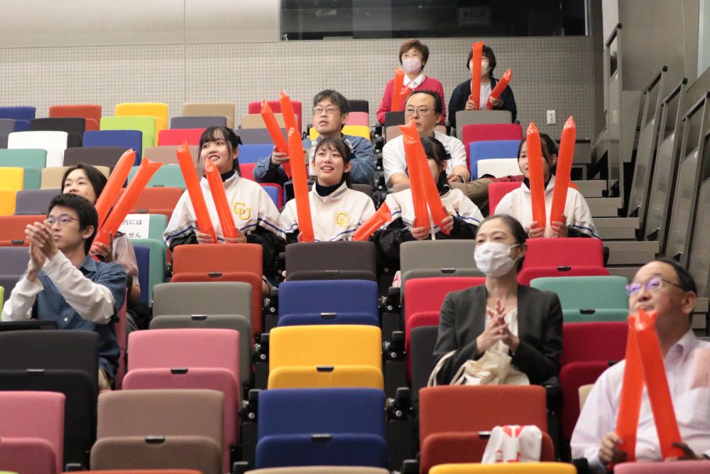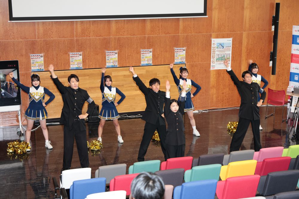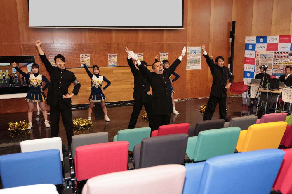 イベント冒頭では、応援団リーダー部とチアリーディング部が駆けつけ、パブリックビューイング会場から出雲へ向けて熱いエールを送りました。