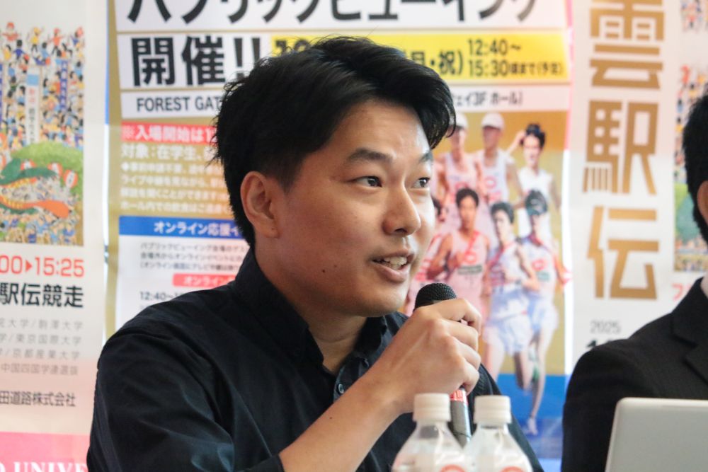 当日解説は、本学駅伝応援イベントでおなじみの櫻井俊宏さん(中央大学法曹界副会長、本学応援団監督)と関口康平さん(2019年理工学部卒業、2018年駅伝主将)。また今回はゲストに藤原正和監督と同世代陸上競技部OBの藤村典史さん(2001年文学部卒業、陸上競技部OB、実業家)をお迎えし、よりディープな解説のお届けとなりました。
