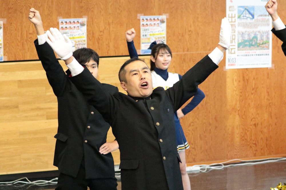ゴール直後、パブリックビューイング会場に応援団が再び登場、櫻井俊宏応援団監督も解説席からステージ中央に立ち、次の全日本大学駅伝と箱根駅伝の健闘を祈念する力強いエールを送り、応援イベントは終了しました。
