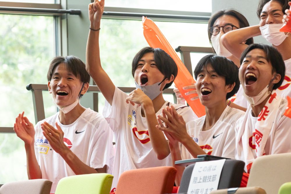 1区・岡田選手のロングスパートに湧く陸上競技部員
