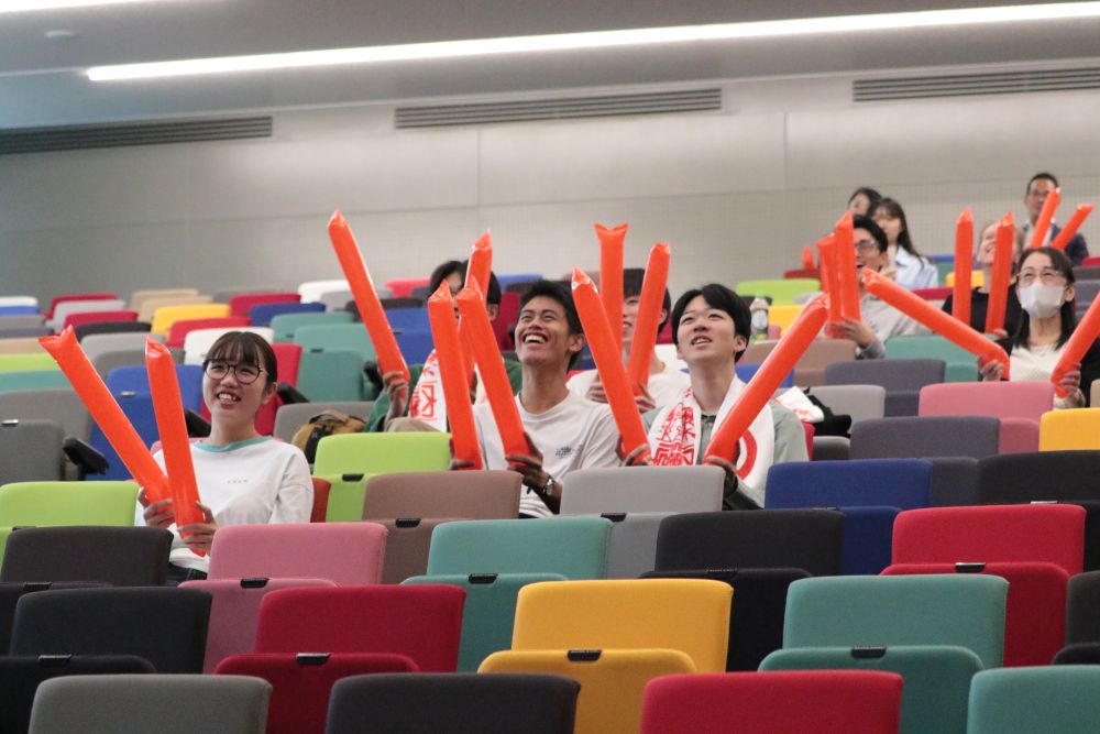スティックバルーンを打ち鳴らして画面に映る中大選手を応援