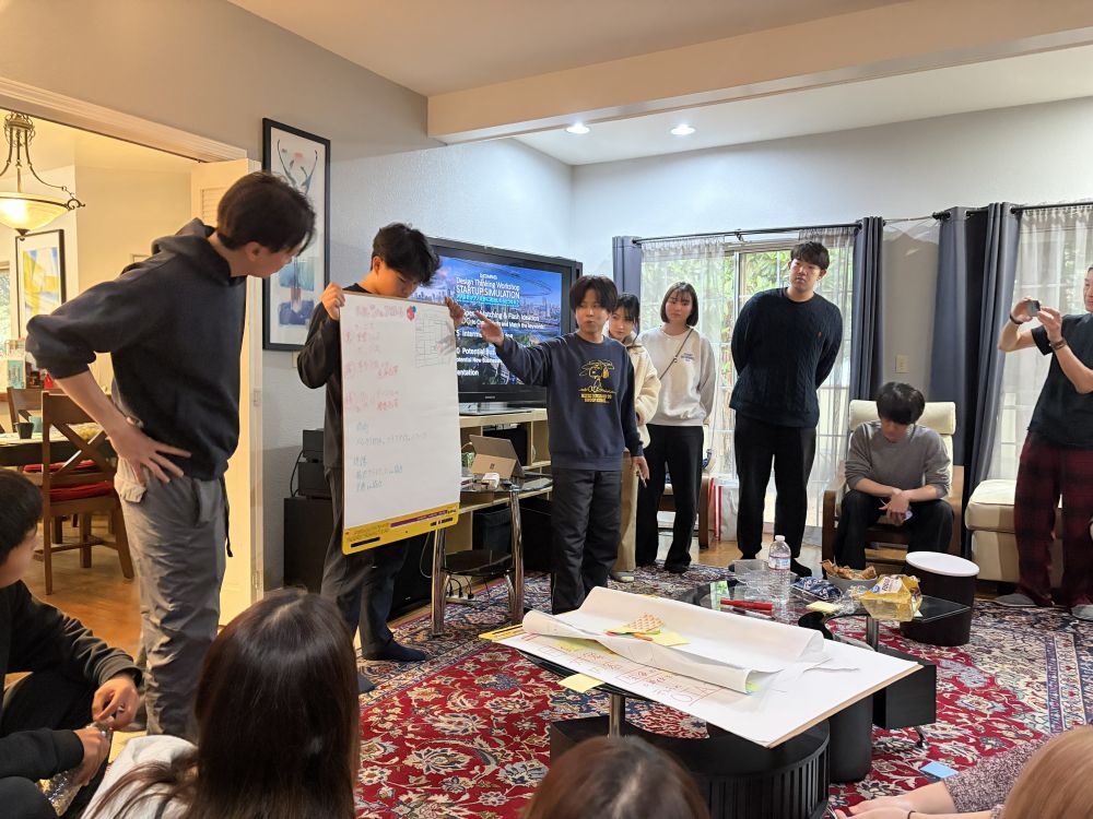 午前中は、グループに分かれて、自身が米国のスタートアップ企業の社員として生み出す新たなビジネスを考案する、デザイン思考のワークショップを実施しました。様々なアイディアが出てくるものの、実現の可能性など、難しさを感じる場面がありましたが、すべてのグループが時間内に発表することができました。また、UC Berkeleyの学生たちに宿泊先にお越しいただき交流をしました。