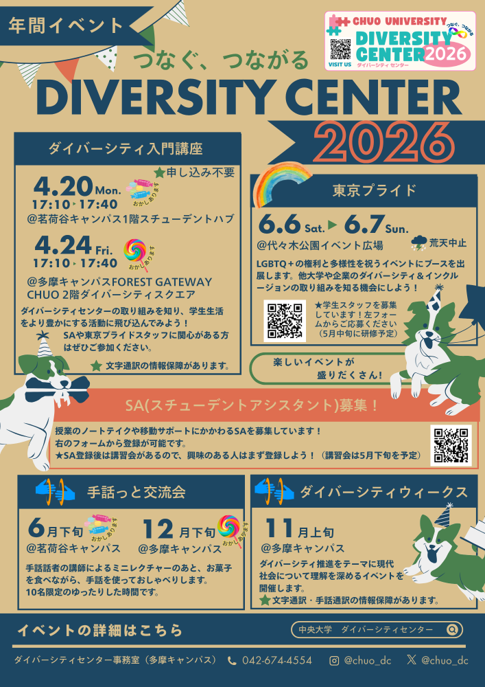 「手話に関心がある」という方に参加してもらいたい交流会、LGBTQ+当事者とアライがともに「性と生の多様性」を祝福する学外の大型イベント(東京プライド)へのブース出展などもありますので、ぜひご参加ください。