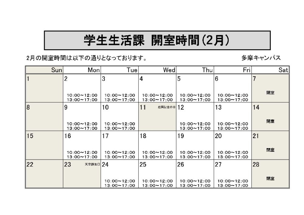 2026年2月 学生生活課(多摩キャンパス)の窓口時間について