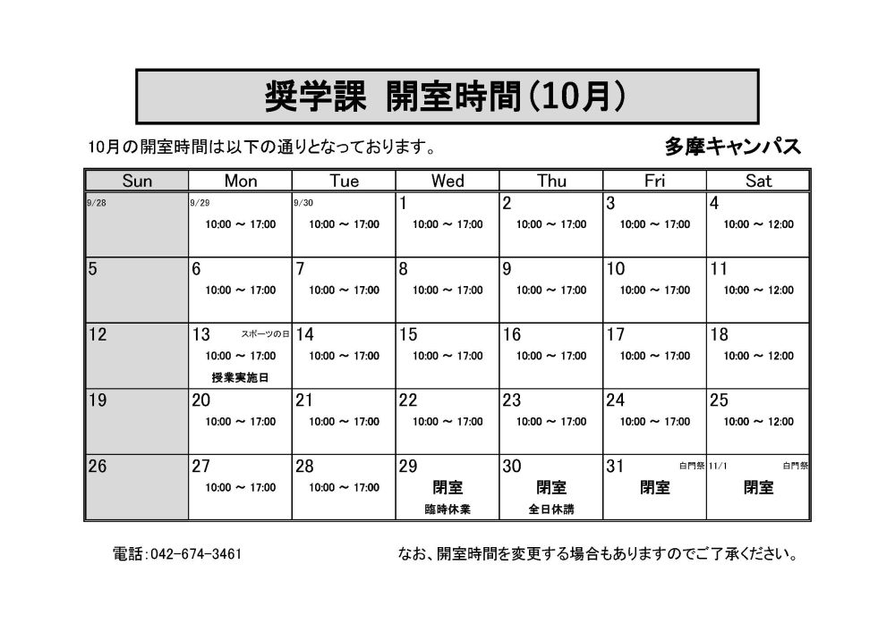 10月の奨学課の窓口・電話対応時間は添付のカレンダーをご確認ください。