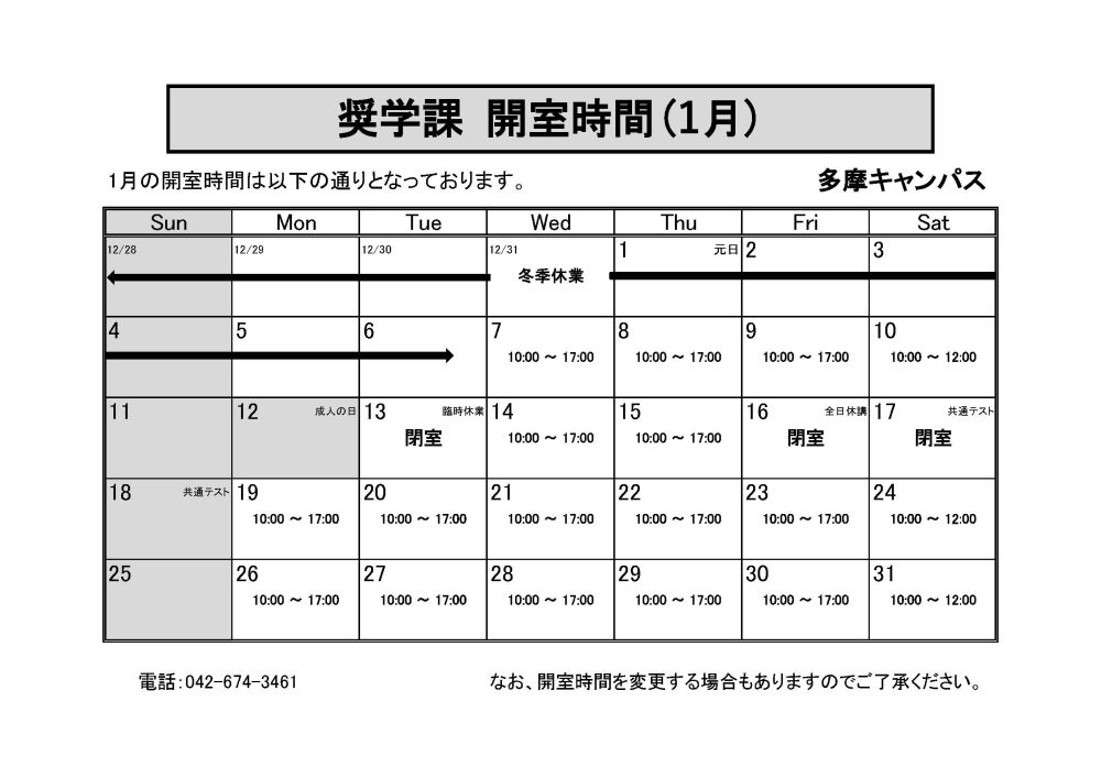 【多摩キャンパス】奨学課の窓口時間について(2026年1月)