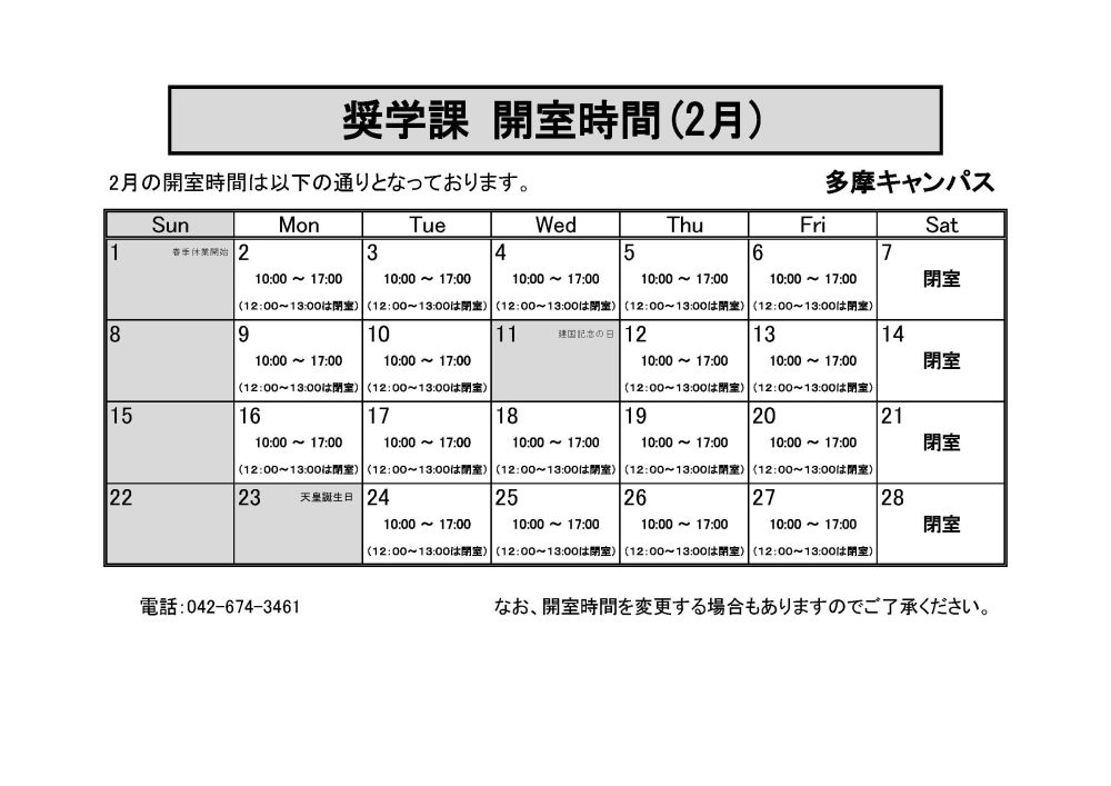 【多摩キャンパス】奨学課の窓口時間について(2026年2月)