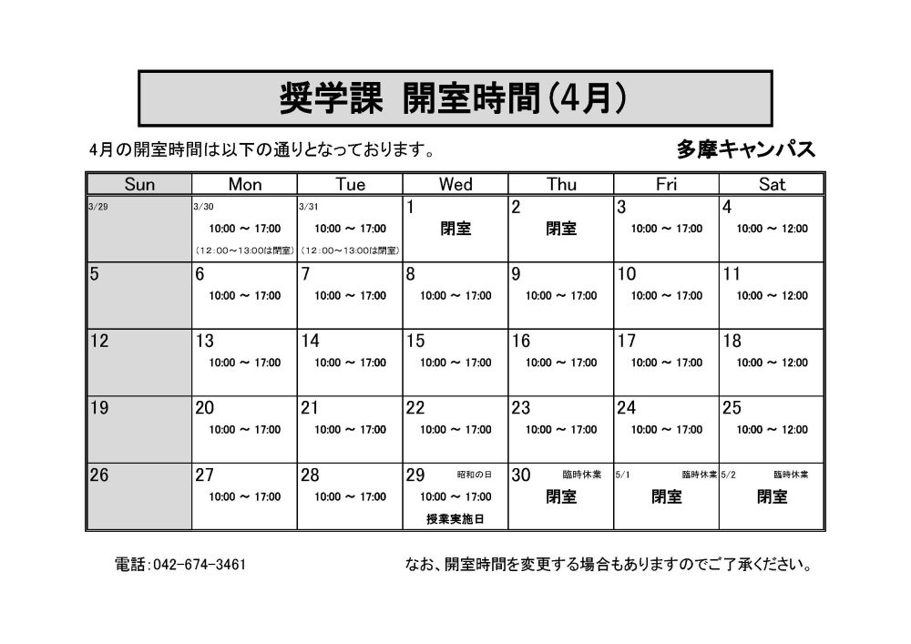 4月の奨学課の窓口・電話対応時間は添付のカレンダーをご確認ください。