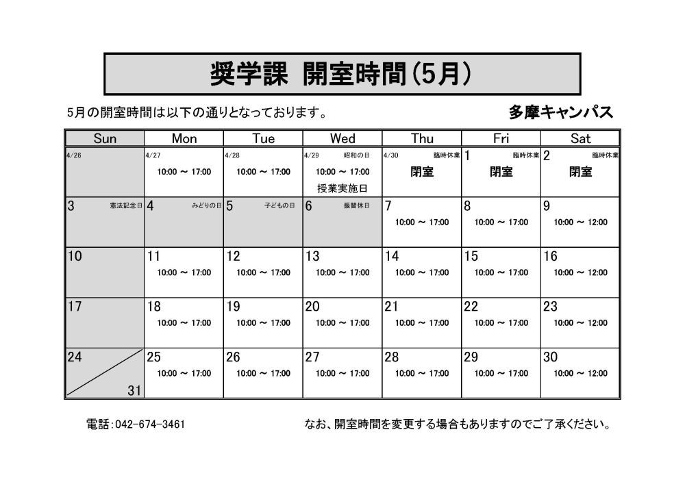 【多摩キャンパス】奨学課の窓口時間について(2026年5月)