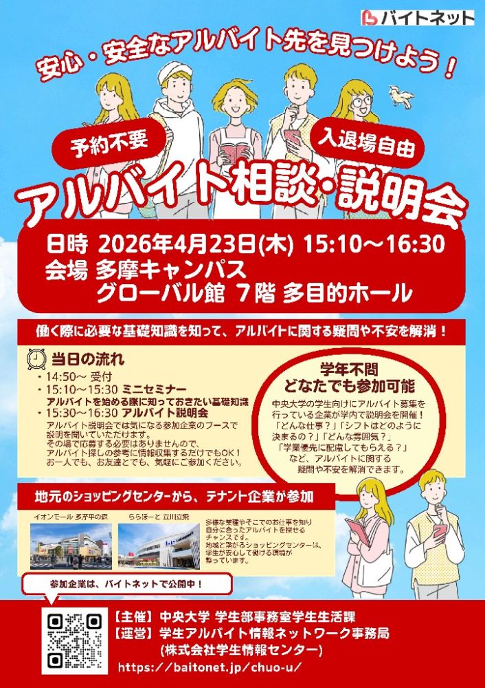 新年度を迎え、アルバイトを検討している方に向けて、アルバイト相談・説明会を開催いたします。