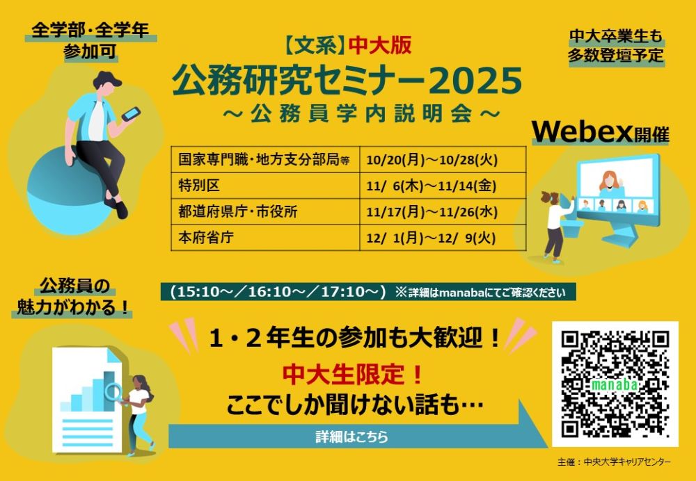 今年度も国家・県庁・市役所等の行政機関の方々が中大生限定で、採用試験の実施状況、魅力、具体的な業務内容の説明をお話します。