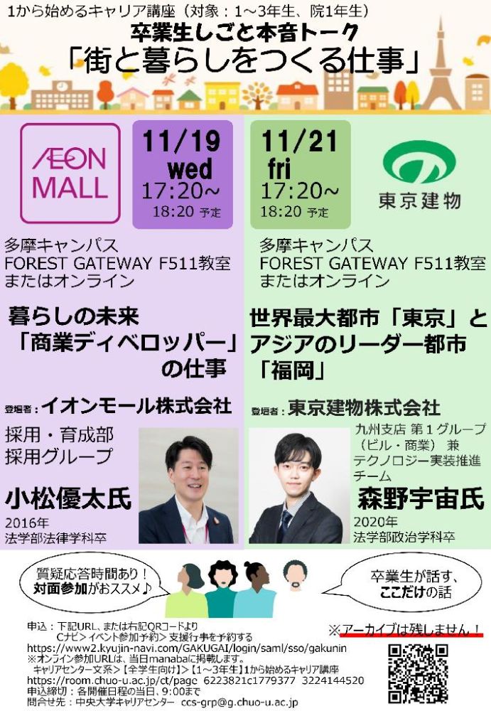 卒業生しごと本音トーク「街と暮らしをつくる仕事」<Day1>2025年11月19日(水)17:20~18:20(予定)
