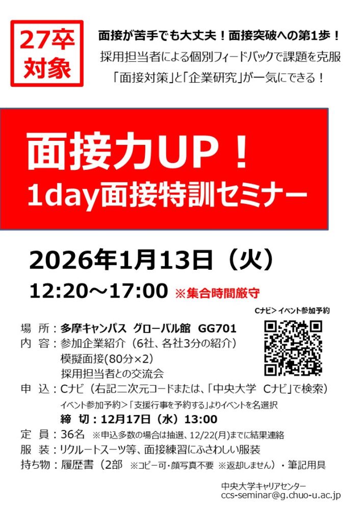 ※結果は12/22(月)までにご連絡します■服装:リクルートスーツ等、面接練習にふさわしい服装